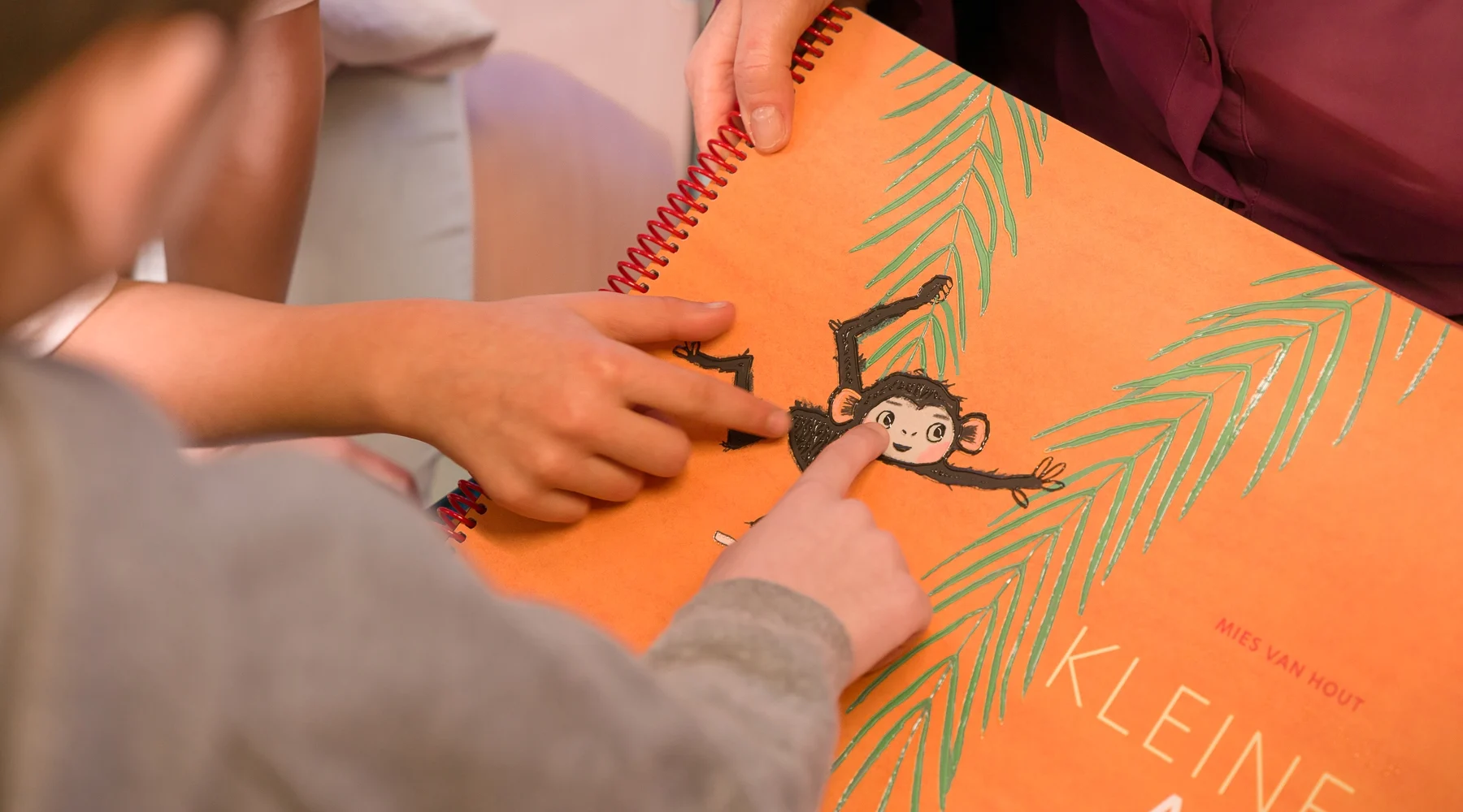 Het prentenboek Kleine Aap vertelt het verhaal van een nieuwsgierige, jonge aap die vol enthousiasme op avontuur vertrekt. Ze wil iets bijzonders delen, maar ontdekt onderweg dat niet iedereen luistert of haar begrijpt. In haar zoektocht ontmoet ze verschillende dieren die elk op hun eigen manier reageren. Pas wanneer ze haar geheim deelt met Olifant, vindt ze écht gehoor en kan ze met trots terugkeren naar huis. De herkenbare thema’s – groeien, vertellen, familie, zelfstandigheid en gevoelens – maken dit verhaal bijzonder geschikt voor kleuters. De tekst gebruikt herhaling en ritme, wat uitnodigt tot meeleven, voorspellen en navertellen. De illustraties van Kleine Aap ademen warmte en beweging. Ze spelen met contrasten tussen licht en donker, tussen rust en actie. Het verhaal ontwikkelt zich van nacht naar dag en weer naar avond – een symbolische groeicyclus: van nieuwsgierigheid en onzekerheid naar inzicht en rust.